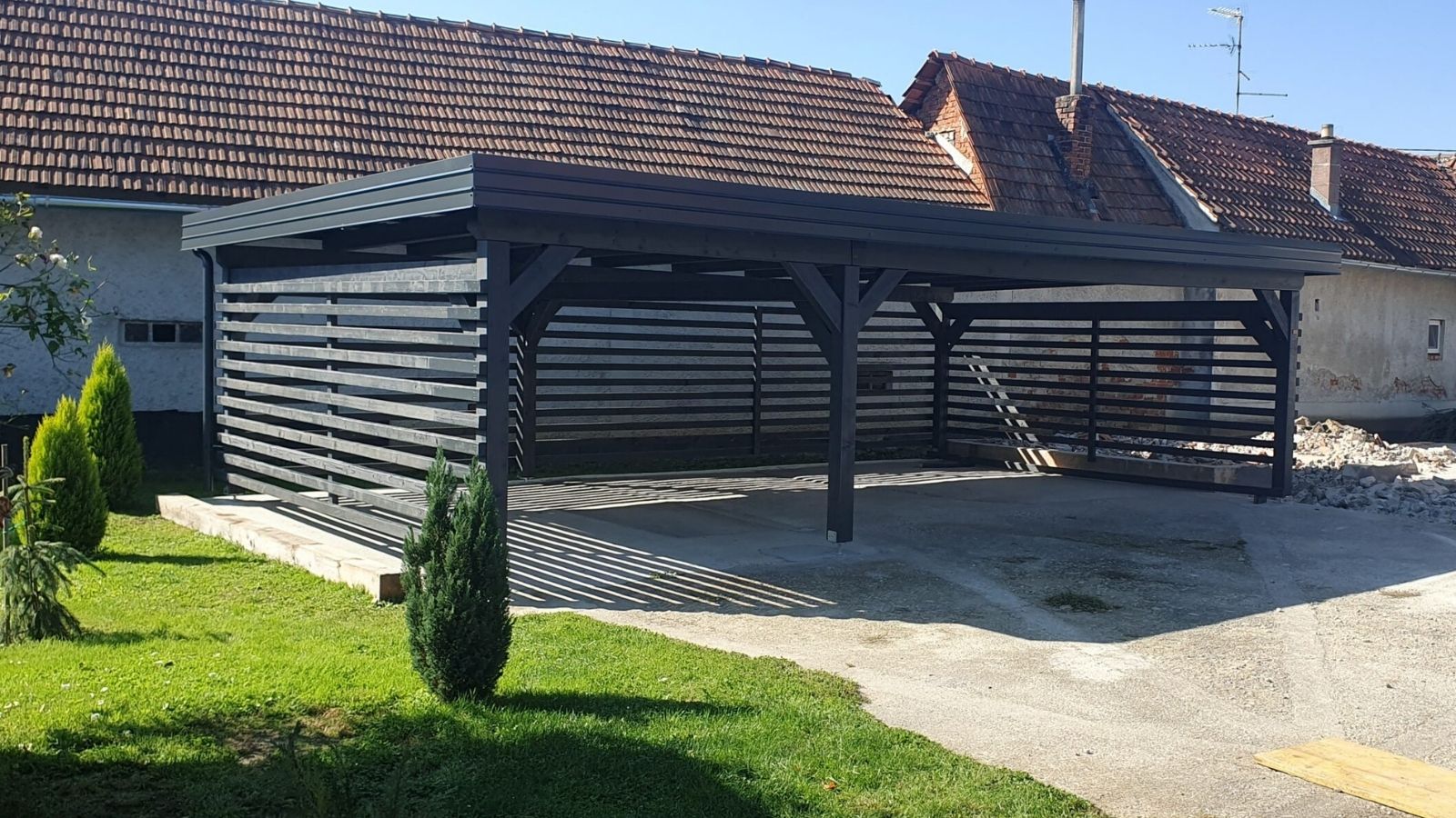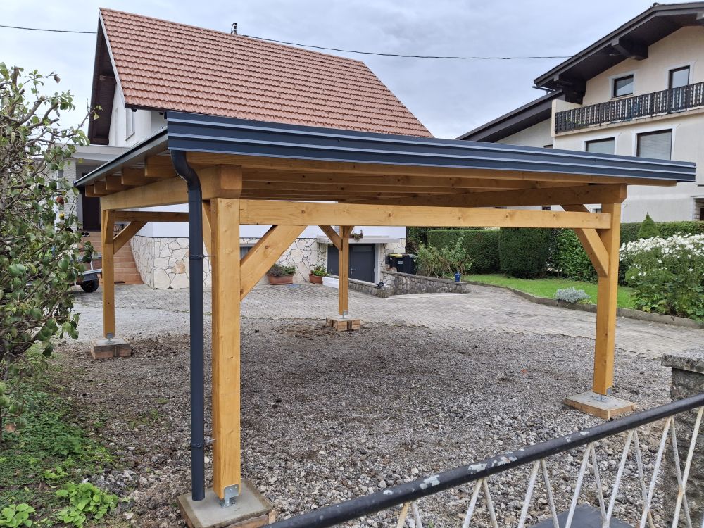 Nosilni strebri so postavljeni na standardni parkirni prostor ali na velikost po meri. Dve vozili: 5,85 m x 5,5 m (strešna površina).